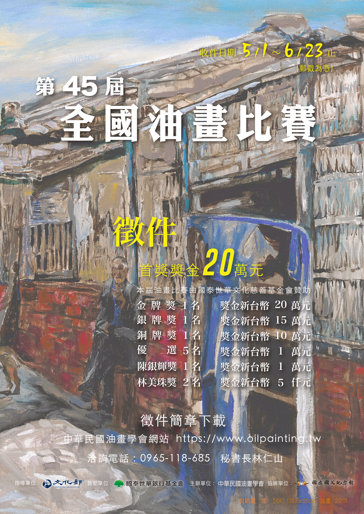 2021第45屆全國油畫展徵件 收件日期:2021年5月1日~6月23日 中華民國油畫學會在1974年由多位前...